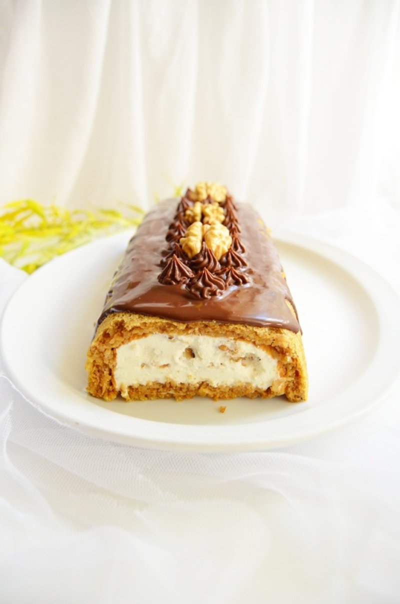 3. Scoate tava din frigider, pune un platou deasupra tavii si rastoarna cu grija prajitura. Da deoparte hartia de copt si taie capetele prajiturii apoi decoreaza cu glazura (reteta glazurii - http://bucatarealalaplesneala.blogspot.ro/2014/10/prajitura-cu-nuca-si-fulgi-de-porumb.html) si cu miez de nuca.