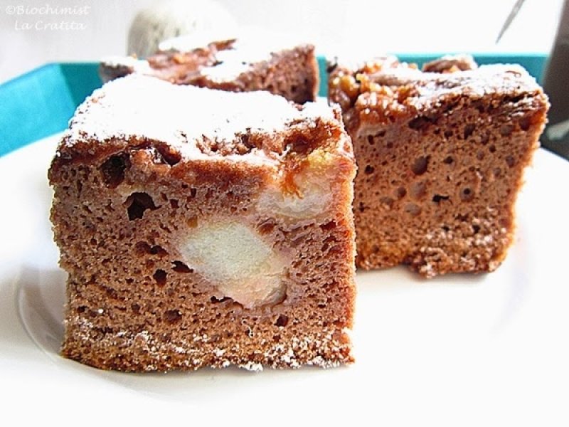 6. Tapetam o tava cu dimensiunile 32 x 22 cm tapetata cu hartie de copt, turnam compozitia si introducem in cuptorul preincalzit. Dupa 10-15 minute scoatem tava din cuptor si punem perele curatate si taiate cuburi, introducem din nou in cuptor pentru inca 50-60 min. Faceti testul scobitorii.