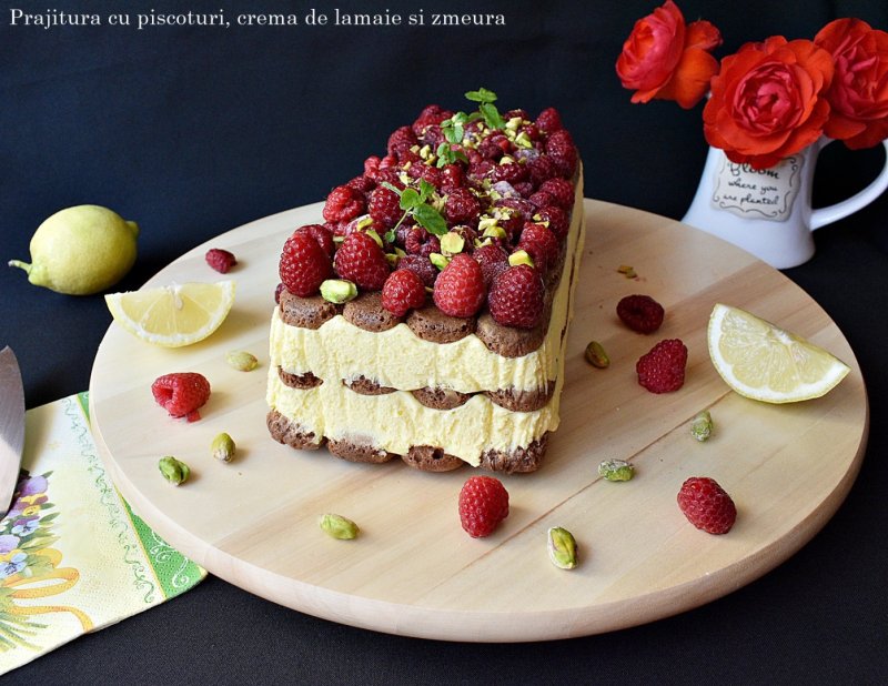 Puneti zmeura deasupra prajiturii (eu am folosit congelata), presarati fistic, apoi este gata de servit.