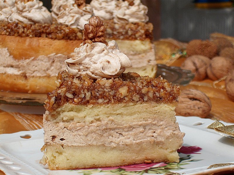 Se caramelizeaza zaharul cu lingura de apa si cand capata culoarea maro deschis se pune miezul de nuca. Se amesteca bine si se da de pe foc. Se adauga repede oul batut, se amesteca repede si se intinde pe toata suprafata prajiturii, cat este fierbinte. Se da la rece apoi se decoreaza cu frisca si piure de castane si bucati de miez de nuca.Se lasa de seara pana a 2 a zi inante de a fi taiata prajitura