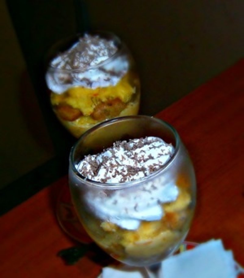 Dupa ce am facut crema, o lasam sa se raceasca, iar intre timp luam 3 pahare pentru vin sau apa cu picior, rupem piscoturile in 3 sau 4 bucatele pentru a le putea aseza mai bine dupa care le inmuiem in cafea si punem un strat de piscoturi dupa care unul de crema, repetam operatiunea inca o data, iar deasupra punem frisca batuta peste care vom razui ciocolata.