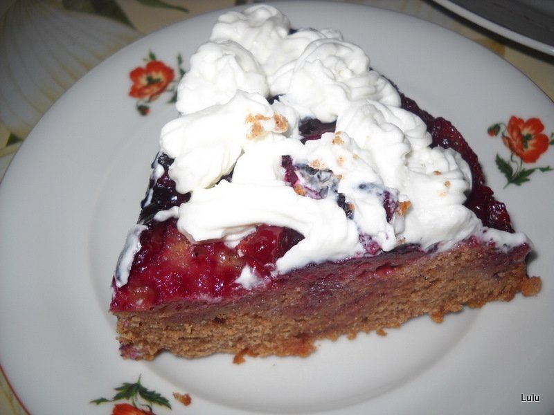 Jumatate din cantitatea de unt,zaharul brun si mierea se topesc intr-o forma rotunda,apoi se aseaza prunele taiate felii iar printre ele alte fructe intregi sau taiate(eu am pus capsune de la congelator);intr-un castron se cerne faina impreuna cu praful de copt si scortisoara;restul de unt se freaca spuma impreuna cu ceasca de zahar,se adauga ouale pe rand,vanilia,esenta de migdale apoi cate o lingura de faina intercalata cu laptele,pana se termina;se rastoarna compozitia peste prune,se da la cuptor la foc mic mai mult de 1h,se lasa sa se raceasca in forma,apoi se rastoarna pe un platou si se orneaza cu frisca