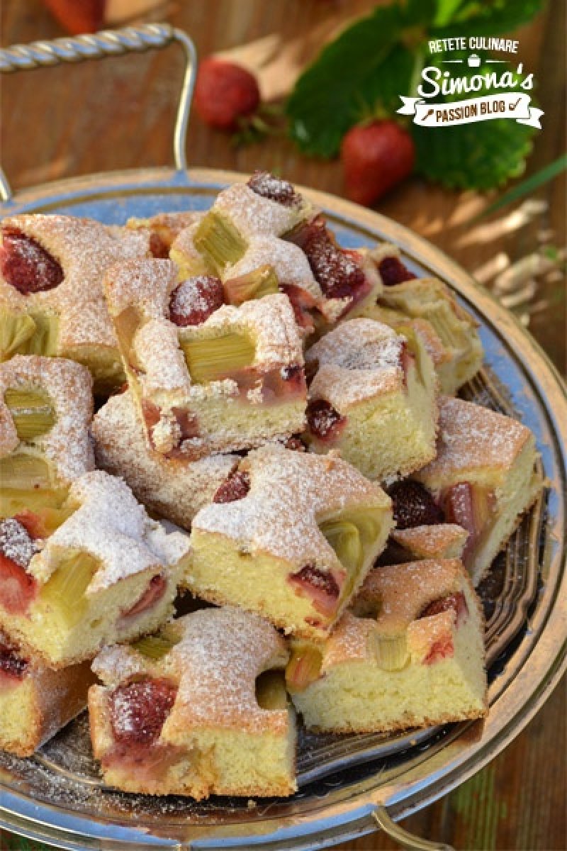 Compozitia obtinuta se pune intr-o tava tapetata cu hartie de copt, iar deasupra se pune rubarba si capsunile.