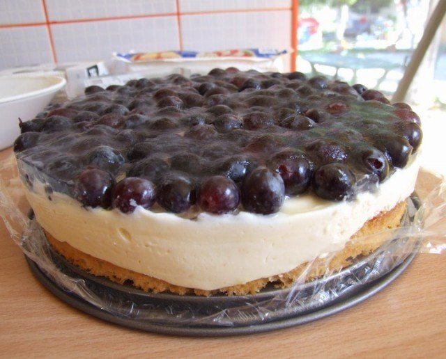 Decorati prajitura cu restul de struguri si turnati glazura transparenta deasupra, urmand instructiunile de pe pachet.