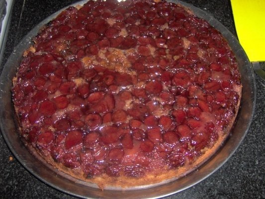Se strecoara visinile si se pun intr-o tava rotunda ptr copt unde lichidele nu curg.Se aseaza visinile pe toata tava si seadauga 1/4 de pahar din lichidul tigaii,si lasam la frigider sa se raceasca.