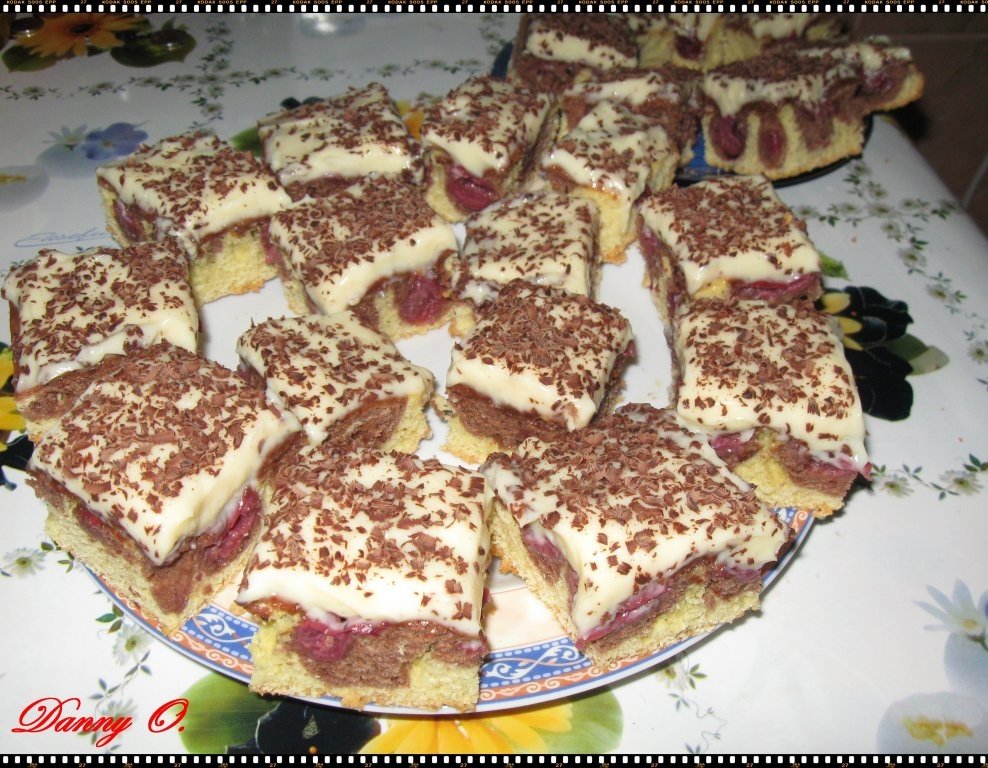 Se pune la fiert, cana de zahar cu 5 linguri de apa. Albusurile se bat spuma, iar peste ele se adauga treptat, siropul fierbinte, galbenusurile, uleiul, aromele si faina. Se amesteca bine, iar un sfert din compozitie, se toarna intr-o tava de copt, de forma dreptunghiulara, nu prea mare, altfel nu o sa fie inalta prajitura. Tava se unge cu unt si se tapeteaza cu faina, in prealabil. In restul de compozitie se pune lingura de cacao, se amesteca bine si se rastoarna peste primul strat de compozitie. Se presara visine fara samburi si scurse de zeama. Se baga la cuptor, la foc potrivit, pana trece de testul scobitorii. Intre timp se prepara crema de vanilie, conform instructiunilor de pe ambalaj. Dupa ce s-a racit blatul, se unge cu crema de vanilie la suprafata, apoi se rade ciocolata pe deasupra. Dupa ce sta un pic la rece se taie in ce forme doriti.