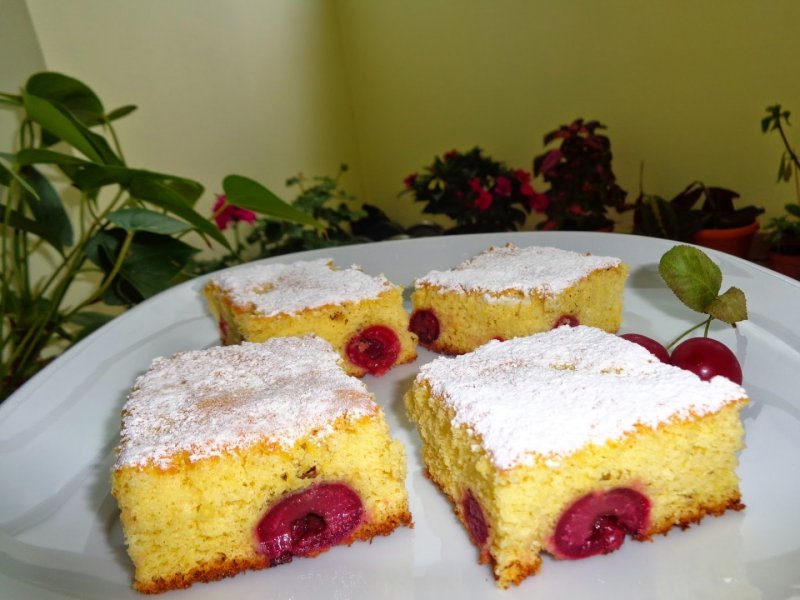Galbenusurile se mixeaza impreuna cu 1/2 din cantitatea de zahar, esentele si coaja de citrice dupa care adaugam treptat uleiul si la final laptele. Varsam lichidul peste faina amestecata amestecata cu praful de copt si incorporam usor cu telul.La sfarsit adaugam cate putin din albusurile batute spuma cu zeama de lamaie si restul de zahar. Punem aluatul intr-o tava tapetata si deasupra repartizam visinele direct congelate, nu necesita decongelare, aluatul va creste fara probleme. O alta varianta ar fi sa batem ouale spuma cu zaharul dupa care sa adaugam restul ingredientelor, asta pentru a face economie de timp.