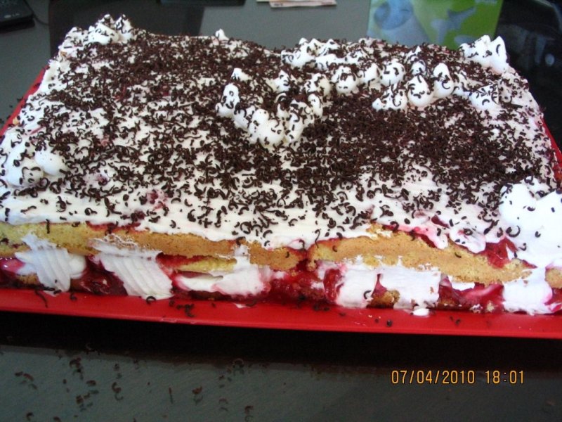 ASAMBLARE: foaie de blat, apoi un start de frisca, cu un sprit facem linii cu frisca iar intre linii adaugam umplutura de visine, urmeaza a doua foaie de blat, un strat de frisca , linii cu frisca si umplutura de visine. Terminam cu cea de-a treia foaie de blat. Acoperim torul cu frisca si decoram dupa preferinta, eu am ras ciocolata.