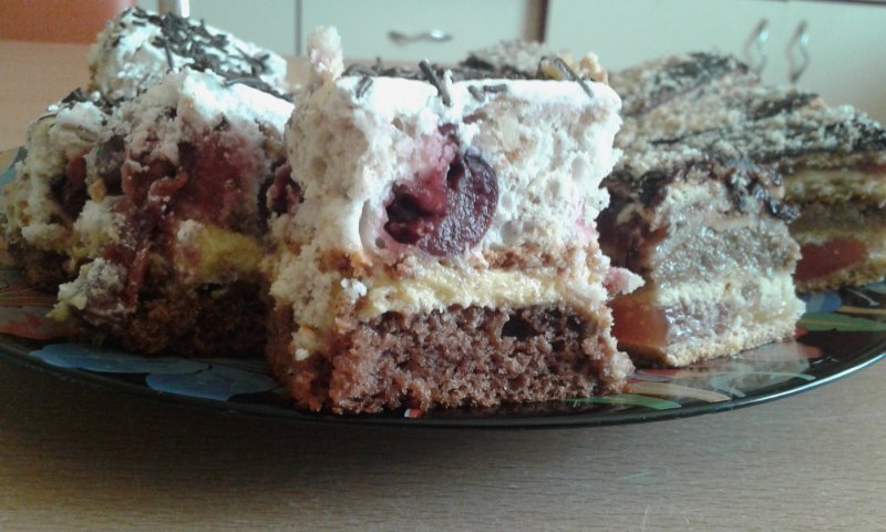 Bezea : mixam spuma albusurile cu un praf de sare, adaugam zaharul, iar la final faina amestecata cu nucile prajite si taiate si visinile (folosim o lingura cand amestecam). Intindem in tava tapetata cu hartie de copt si coacem.