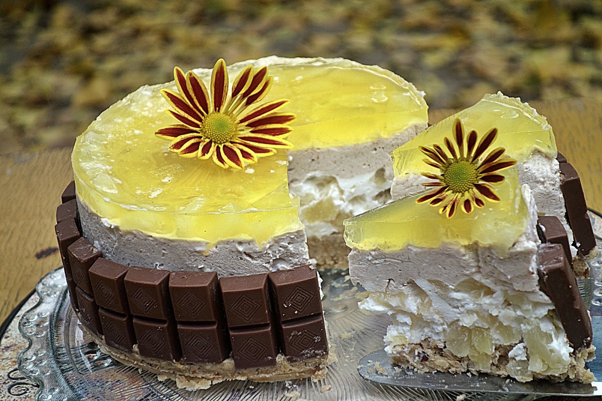 Se dizolva in siropul ramas de la compot plicul de tort jelle si se da intr-un clocot, amestecand continuu cu o lingurita si apoi turnata fierbinte deasupra prajiturii. Se da la rece inca 30 minute, pana portionam prajitura.