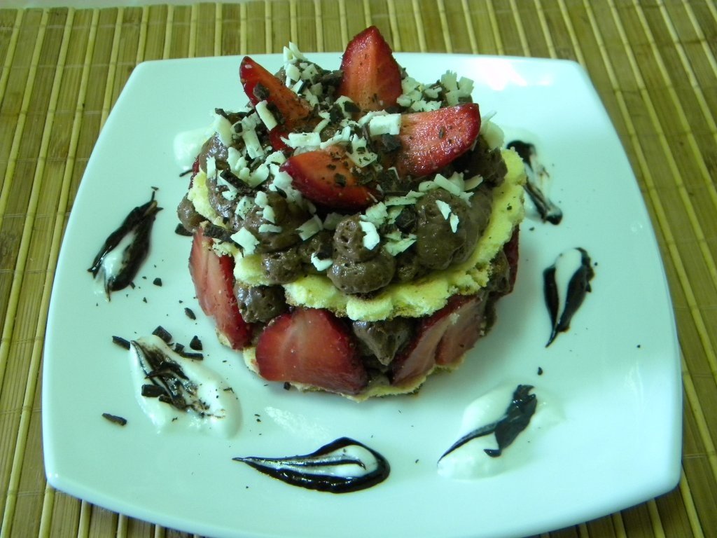 Se pune pe o farfurie cate un cerc de aluat, apoi spuma de ciocolata, alt cerc de aluat, din nou spuma de ciocolata.