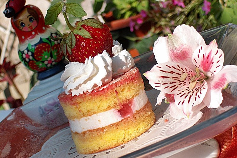 3.Se monteaza prajitura in forma reglabila asezand prima parte de blat apoi se insiropeaza usor cu jumatate din siropul ramas de la fructele fierte apoi se toarna crema care o preparam mixand smantana cu branzica si zaharul pudra apoi adaugand si gelatina hidratata in apa rece apoi topita la bain marin.Se presara capsunile fierte si scurse,pe toata suprafata cremei,se acopera cu cea de a 2-a parte de blat care se presara usor cu mana apoi se insiropeaza cu restul siropului ramas.Se da la rece cel putin 2 ore(cel mai bine de seara pana a 2 a zi)apoi se taie in bucati mai mici,patrate sau romburi,se decoreaza cu frisca proaspata si jumatati de capsuni.