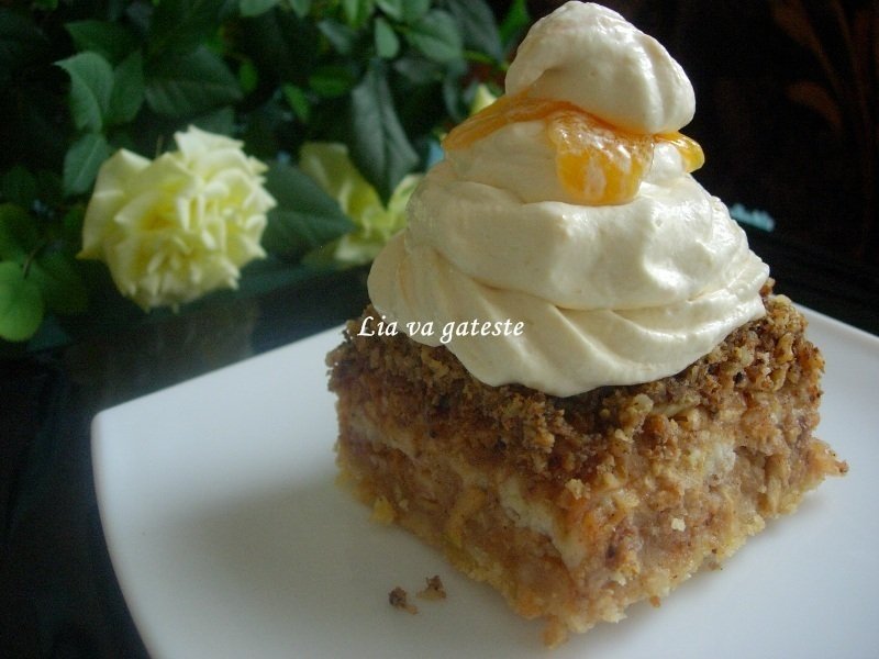 Lasam prajitura sa se raceasca in tava, dupa care o transferam pe o tava/platou si o portionam. Se poate servi ca atare sau cu un mot generos din frisca, simpla sau cu amestec de fructe, cum am servit eu.