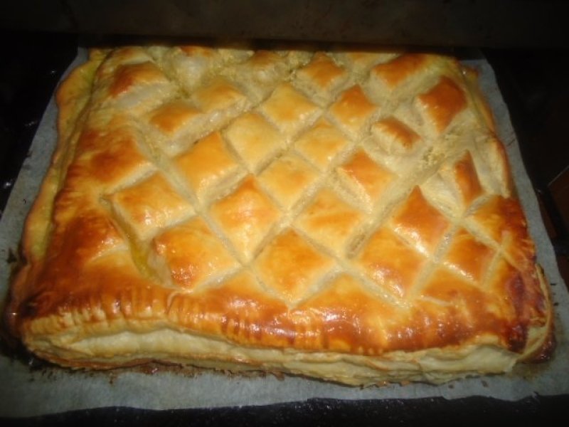 Ungem cu glazura de ou si dam la rece pentru cateva minute, apoi la cuptorul incins pana se rumeneste. Se serveste calda.