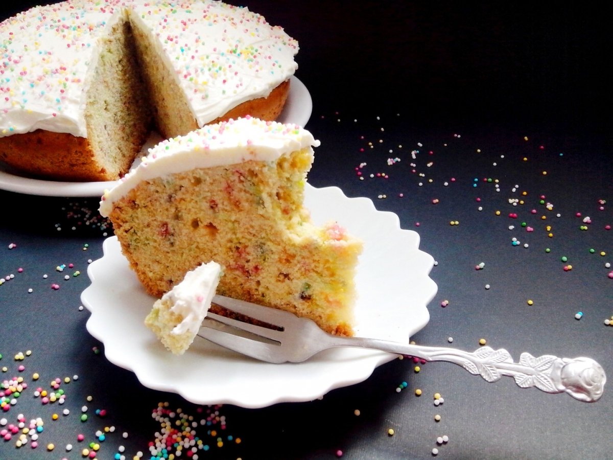 Am mixat bine untul topit cu zahărul, până când am bţinut o cremă fină. Am adăugat pe rând zahărul vanilinat, oul, laptele, făina, mixând bine să dispară cocoloaşele. Apoi am adăugat funfetti şi am amestecat uşor cu o spatulă.