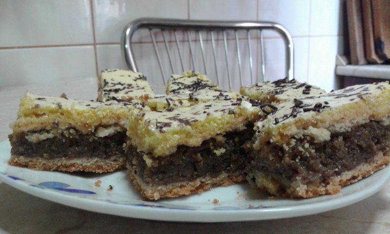 Se face o cocă, după care se împarte în două. Se întinde prima foaie în tavă, peste ea punem un strat de gem de caise, peste care se pune umplutura făcută din nucă măcinată, zahăr, 1 plic de vanilie şi spuma de la 4 albuşuri. Se pune a doua foaie şi se dă la copt. Când este coaptă, peste prăjitura fierbinte se pune o glazură făcută din 4 gălbenuşuri frecate cu 200 g zahăr pudră, peste care radem ciocolată. Prăjitura fiind fierbinte, se usucă glazura. În loc de nucă putem pune cocos, dar neapărat în aluat trebuie pusă cacao pentru ca prăjitura să aibă un aspect foarte placut.