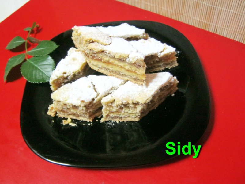 Se tapeteaza o tava cu hirtie de copt, se intinde prima foaie , se presara nuca amestecata cu zahar dupa gust, zahar vanilat si esenta de rom. Se intinde a doua foaie se unge cu gem . Se procedeaza la fel si cu cealalta foaie si se pune nuca cu zahar pe ea.Deasupra ramine a patra foaie goala, pe care o intepam putin cu furculita.