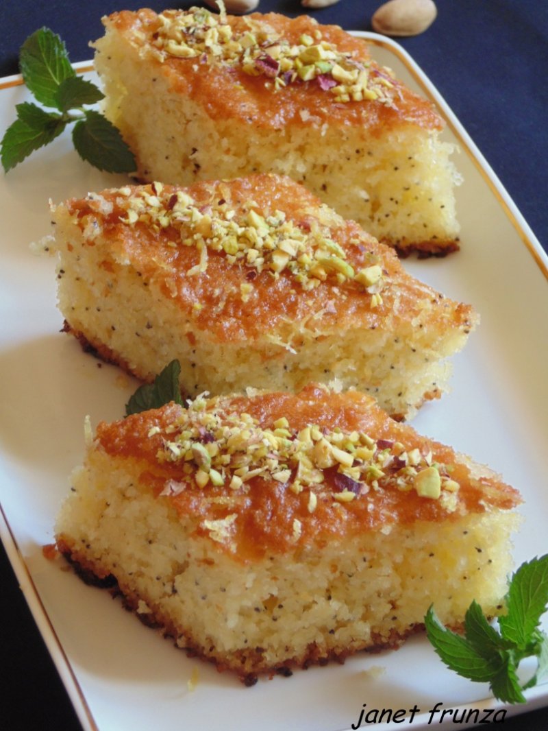 Dam la cuptorul de dinainte incins, la 180 de grade C, cam 35-40 de minute sau pana cand se rumeneste frumos (se face proba cu scobitoarea). Dupa ce s-a rumenit, se scoate si asa fierbinte, cu un cutit bine ascutit se portioneaza prajitura, in tava si apoi se toarna deasupra tot siropul racit. Se lasa prajitura sa absoarba siropul si se serveste presarata cu fistic tocat marunt.