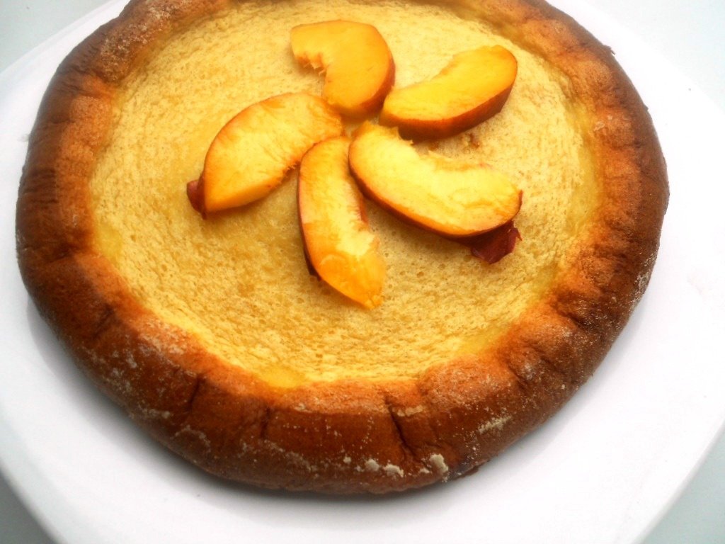 Rezultatul final il vedeti in poze, prajitura s-a rumenit frumos pe margini, iar ca si decor am folosit cateva feliute de piersica, pentru a intregi acest tablou apetisant. :)