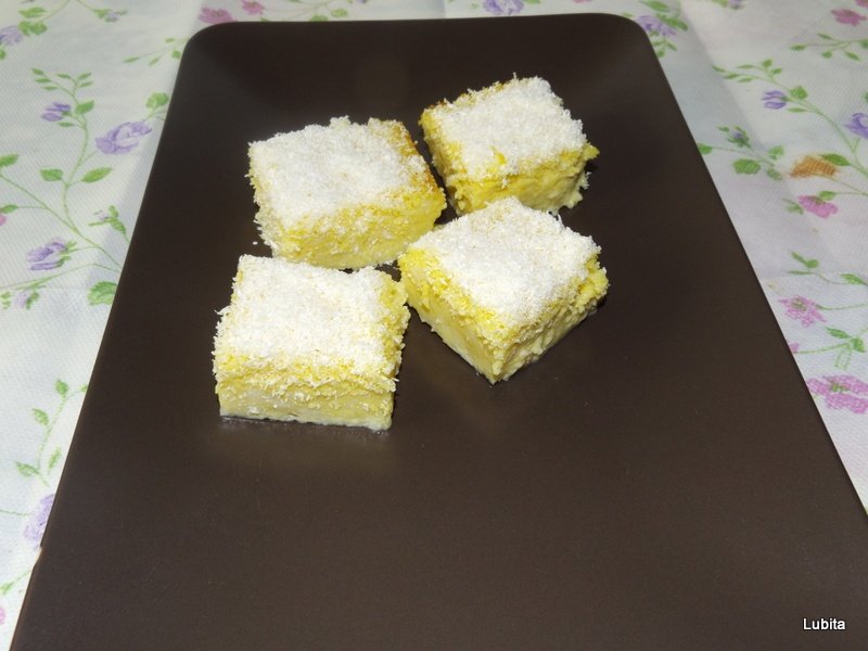 Se rastoarna compozitia intr-o tava mare unsa cu unt si se lasa la cuptor la foc mic 40-50min(pana se rumeneste). Dupa ce este gata, se scoate tava din cuptor, se presara nuca de cocos deasupra apoi se lasa sa se raceasca foarte bine,dupa care se taie si se pune pe platou.