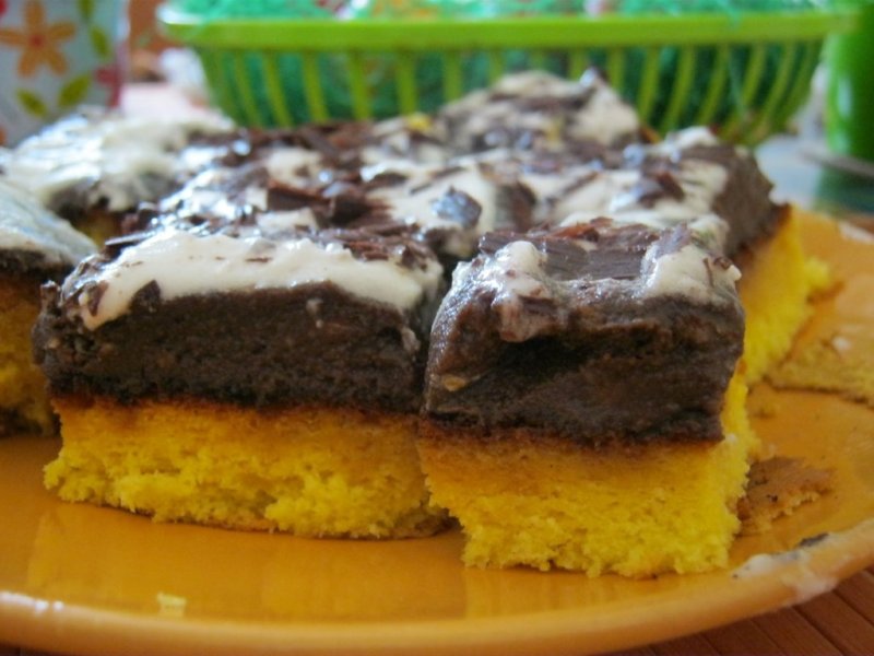 Am uns blatul de pandişpan cu crema rezultată,peste care am turnat bezeaua făcută la bain-marie,peste care am ras ciocolată.
