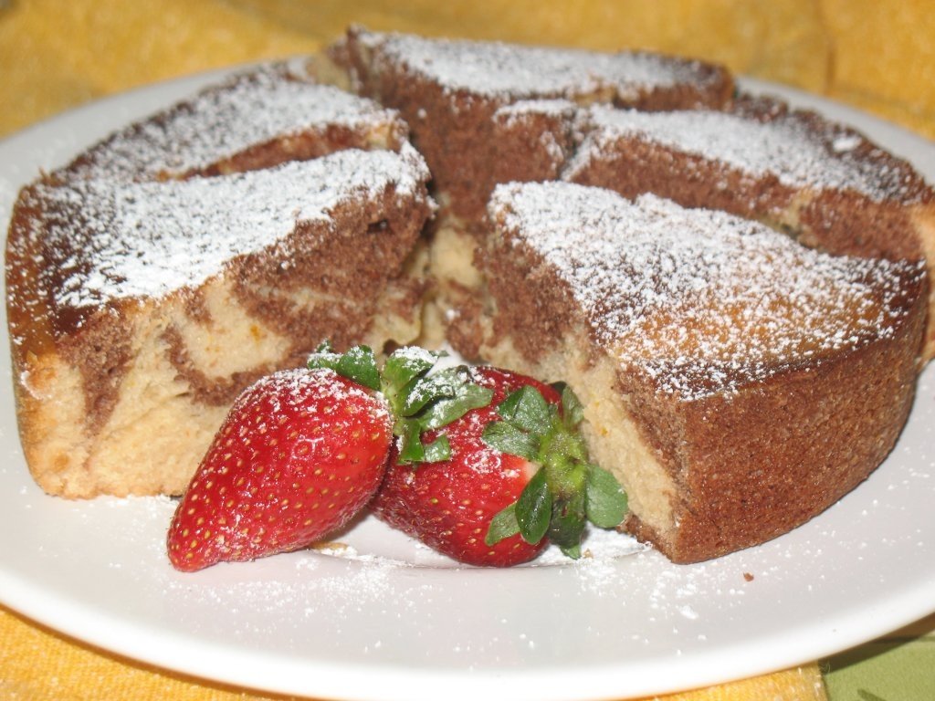 Se amesteca bine zaharul cu laptele apoi se adauga treptat faina si praful de copt, se separa in 2 compozitia in una se pune cacao iar in cealalta coaja de portocala (sau nuca de cocos, vanilie). Intr-o tava unsa si tapetata cu faina se toarna un strat alb apoi un altul negru pana se termina. Se coace la 160° timp de 40-45 minute. Dupa ce s-a racit se pudreaza cu zahar pudra.