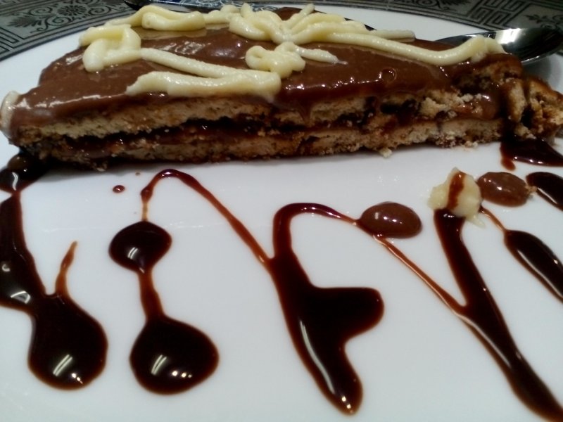 (Se poate face un blat din biscuiti si unt ca si la cheesecake, folosind forma cu pereti detasabili, dar cu biscuiti in straturi este mult mai gustoasa si nu are nici prea mult unt.)