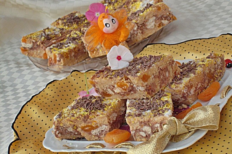 2. Se asaza o folie alimentara intr-o tavita si se intinde jumatate din amestecul de biscuiti cu miere si caise apoi deasupra se vine cu amestecul de biscuiti cu cacaoa se vine deasupra, cu ultimul strat, restul de biscuiti cu miere. Se preseaza bine deasupra, se pudraeaza cu zahar vanilat, se presara nuca de cocos deshidratata si ciocolata data prin razatoarea mica. Se da la rece cel putin 2 ore inainte de a o taia in romburi sau patrate.