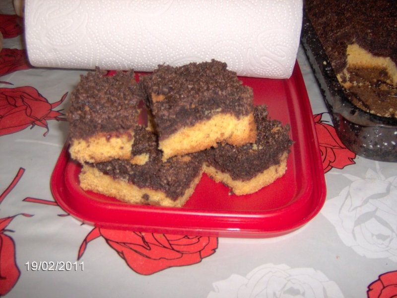 Se face un aluat din 8 galbenuse frecate cu zahar. Cind zaharul nu se mai simte, se adauga uleiul treptat, dupa care se adauga faina tot treptat, ca alautul sa nu se intareasca si sa-l putem turna in tava unsa cu putin ulei si tapetata cu pergament.
