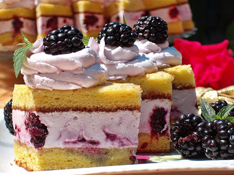 Pentru crema se mixeaza frisca pana se intareste bine, se toarna siropul in fir subtire apoiincorporam tot in fir subtire si gelatina hidratata in 100 ml apa rece si apoi topita la bain marin. Se toarna crema peste blatul din forma se presara deasupra murele scurse de sirop apoi se aseaza deasupra cealalta jumatate de blat, se preseaza usor cu mana si se da la rece cel putin 2 ore,de preferat este de seara pana a 2 zi, apoi se taie dupa forma dorita. Se decoreaza fiecare bucata cu frisca mixata si intarita in care am adaugat siropul de mure, in fir subtire si fructe proaspete.