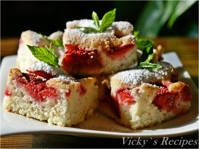 -Se toarnă aluatul în tavă, se nivelează ușor și se așează după dorință jumătățile de căpșuni deasupra, cu partea tăiată în jos.