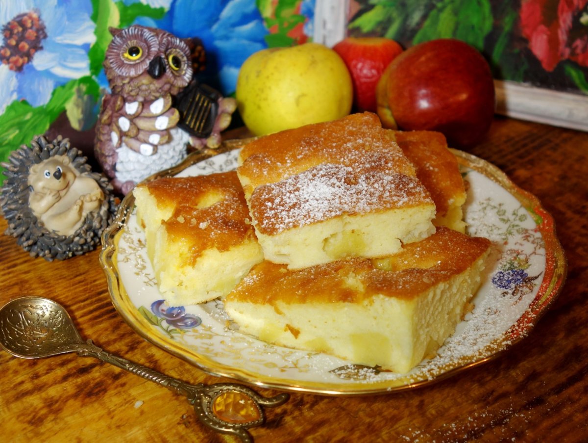 Se curate merele de coaja, se inlatura cotorul si se taie cubulete. Sepun merele peste aluat, se amesteca bine si se toarna compozitia intr-o tava tapetata cu hartie de copt.