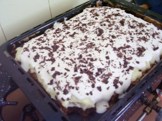Dupa ce s-a racit insiropez blatul, pun budinca si frisca. Pentru frisca folosesc 300ml smantana si zahar dupa gust.