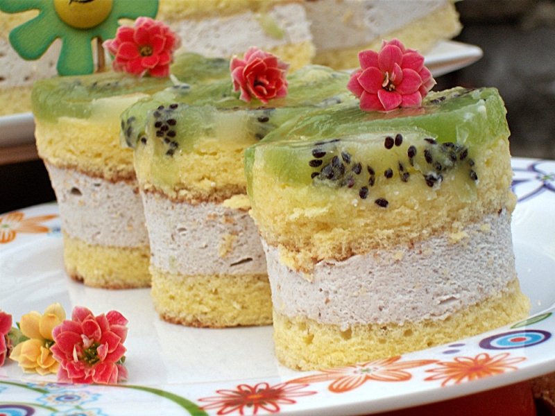 Se curata de coaja fructele de kiwi, se taie in felii subtiri apoi se aseaza una langa alta deasupra blatului prajiturii.
