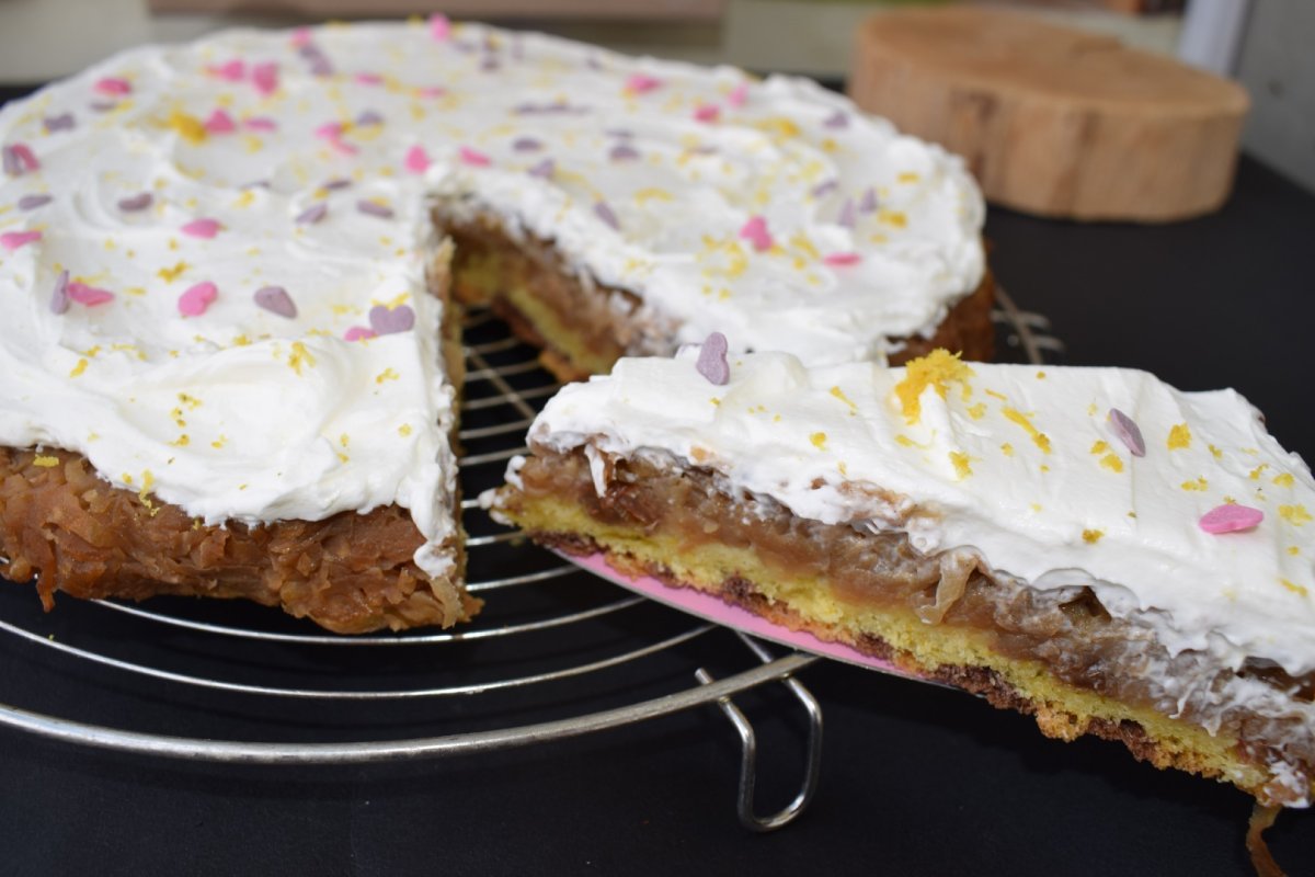 Lasam prajitura la racit putin si o rasturnam pe un platou sau pe un gratar. Trebuie sa raceasca foarte bine inainte sa intindem frisca peste ea.
