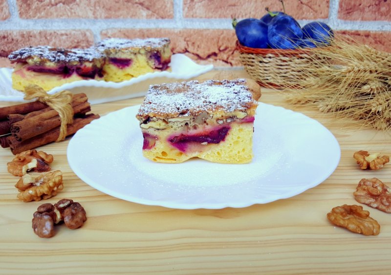 Intr-o tava unsa cu ulei si tapetata cu hartie de copt se pun miezul de nuca, zaharul, zaharul vanilat si scortisoara si se amesteca. Se asaza pe toata suprafata tavii, apoi se pun prunele (spalate, taiate pe jumatate si cu samburele scos) cu miezul pe nuci.