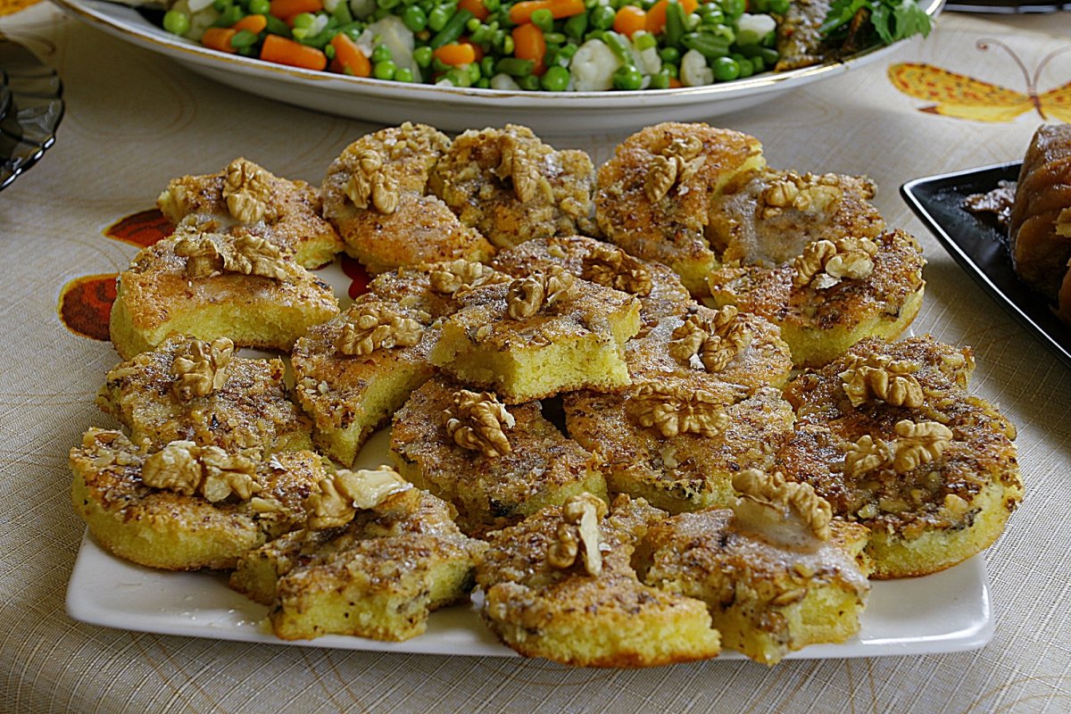 Se scoate prajitura din cuptor ,se toarna deasupra glazura de zahar si se taie sub forma de semiluni,ajutandu-ne de gura rotunda a unui pahar.Se decoreaza cu miez de nuca.