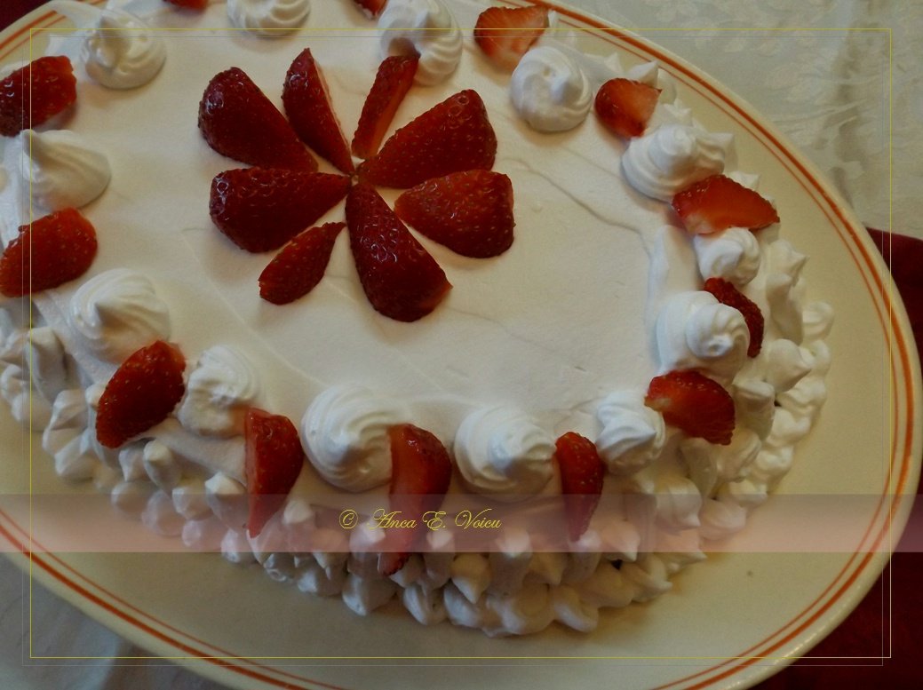 Pentru 1 iunie, am pregatit o prajitura cu piscoturi, crema de vanilie, frisca si capsuni.