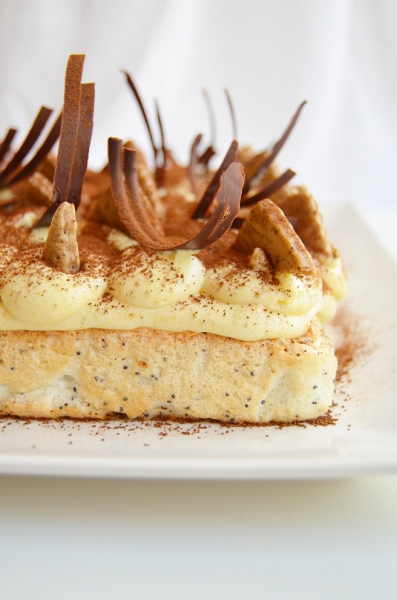 1. Pui blatul pe un platou. Torni crema intr-un pos cu dui simplu, mare, si o pui deasupra in doua straturi. Introduci in frigider pentru 5 minute. Scoti de la frigider si spritezi restulde crema apoi introduci din nou in frigider, de data aceasta pentru o ora cel putin.