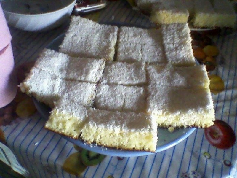 Amestecam galbenusurile cu zaharul pina se topeste apoi adaugam untul, grisul amestecat cu praful de copt si iaurtul; la sfirsit adaugam coaja de lamiie, zaharul vanilat si albusurile batute spuma. Punem compozitia intr-o tava tapetata cu gris sau cine vrea sa fie mai crocanta o tapeteaza cu nuca de cocos (eu folosesc gris) si se da la cuptor 20-25 de minute.