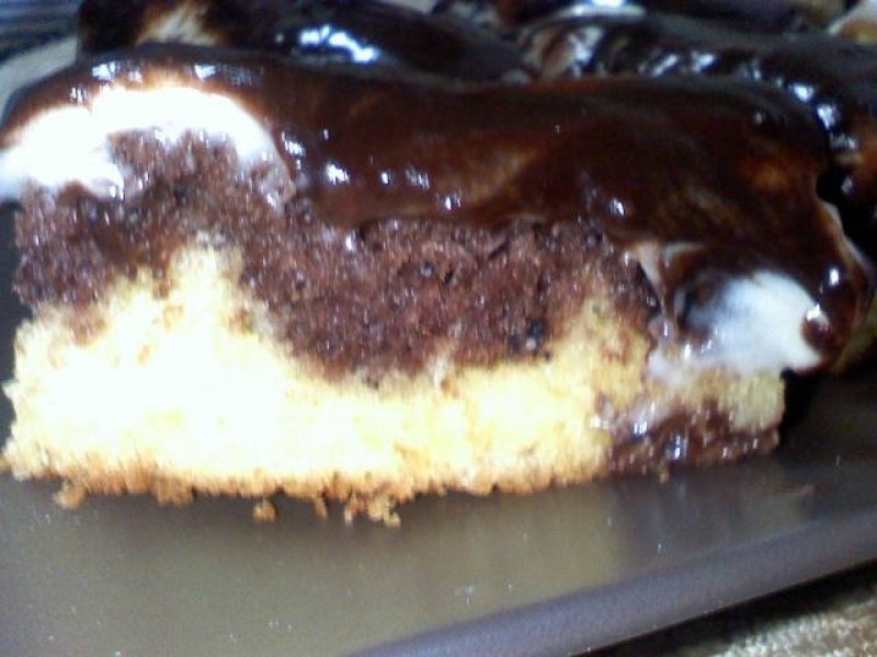 Am frecat untul cu zaharul.Cand s-a topit zaharul pe jumatate, am adaugat ouale unul cate unul si am batut pana ce s-a topit zaharul de tot.Faina am amestecat-o cu praful de copt si apoi am adaugat-o un compozitia de oua si unt.Compozitia a iesit ca o smantana groasa.Am turnat o parte (jumatate sau trei sferturi) in tava tapetata cu hartie de copt.Compozitia ramasa am amestecat-o cu cacao si am turnat-o peste compozitia alba.Am nivelat si am pus compozitia la cuptor pentru 35 de minute la treapta 2.