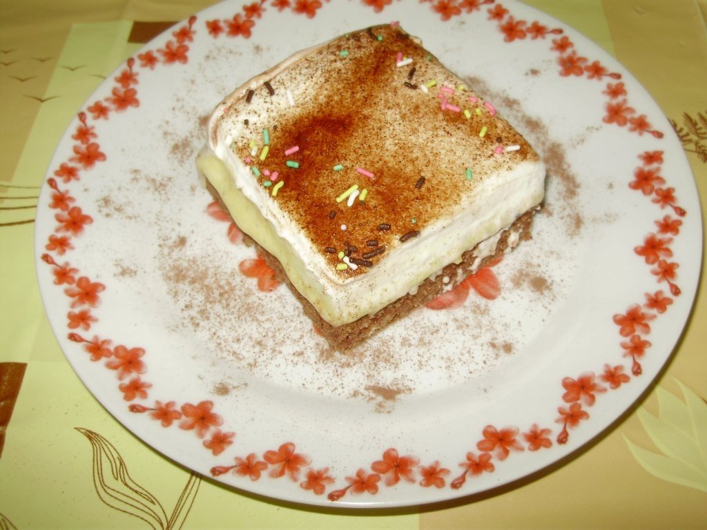 Crema:4 galbenusuri se amesteca cu 2 linguri de faina si vanilia, apoi treptat turnam laptele si punem pe foc pana se ingroasa, dam deoparte si lasam sa se raceasca.dupa ce sa racit adaugam untul, pe care l-am frecat spuma.