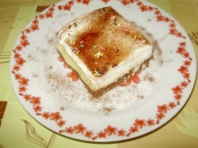 Blatul: Se separa galbenusurile de albus, se bate albusul cu un praf de sare si treptat se adauga zaharul, adaugam galbenusurile unul cate unul si amestecam cu o spatula de jos in sus, pentru a nu se lasa compozitia. Adaugam si faina, praful de copt si cacaua. Se pune compozitia intr-o tava in care am pus hartie de copt si dam tava la cuptor pentru cca 30 minute, la 160 grade.