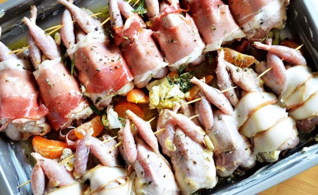 Inveleste cateva dintre ele cu felii de prosciutto, iar pe celelalte cu felii de sunca de casa. Infige scobitori in pulpele prepelitelor pentru a le tine cat mai stranse in timpul gatirii, apoi prin piept pentru ca feliile de prosciutto/sunca sa ramana in jurul carnii.