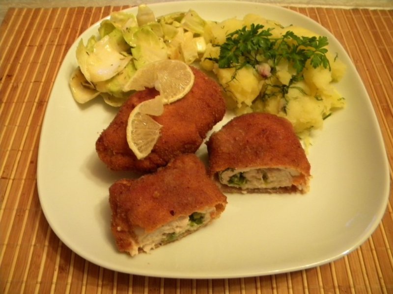 Intr-un bol se pune untul, care trebuie sa fie moale, sarea, coaja si sucul de lamiae, usturoiul pisat marunt, ceapa verde si patrunjelul tocat marunt. Se amesteca totul foarte bine. Se pune compozitia pe o folie de plasic alimentar si se ruleaza intr-un sul, apoi se lasa la frigider pentru 30 de minute sa se intareasca bine. Intre timp pieptul de pui se imparte in 4 bucati. Fiecare bucata se bate usor ca la snitele, cu grija sa nu se rupa (este bine sa asezati deasupra puiului o folie de plastic alimentar).