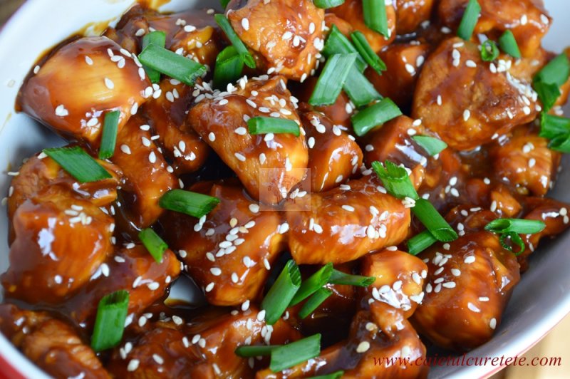 Taiem pieptul de pui cuburi si le punem intr-un vas. Turnam pest ele sucul de la portocale si sosul de soia. Pisam usturoiul si radem ghimbirul. Omogenizam si dam la frigider pentru 15-20 minute.