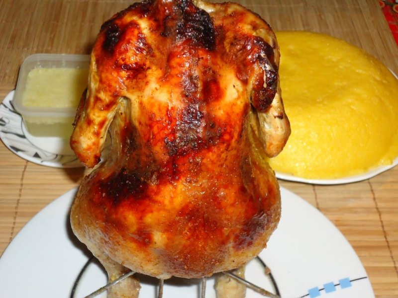 Dupa aproximativ o ora si 30 de minute se inteapa puiul cu o scobitoare pentru a verifica daca mai iese sange la incheieturile pulpelor. Daca nu este numai bun pentru a fi savurat aläturi de un mujdei de usturoi si mamaliguta.