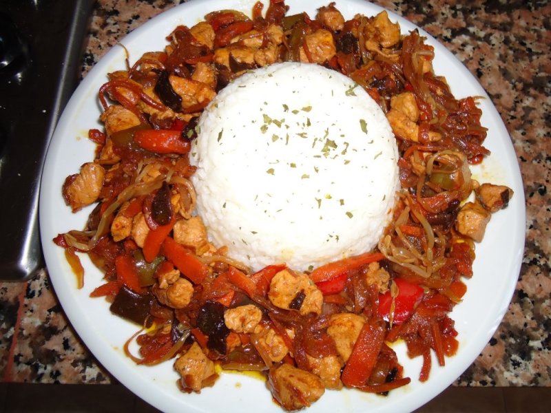 Amestecam totul la foc iute vreo 5 min. Normal se serveste impreuna cu un bol de orez dar se poate manca si asa. Spalam orezul si il punem la fiet in 900 ml -1l apa cu un praf de sare. Amestecand continuu ca sa nu se lipeasca,din momentul in care incepe sa fiarba apa 8-10min.Se pune pe o farfurie intinsa in mijloc iar langa puiul chinezesc.