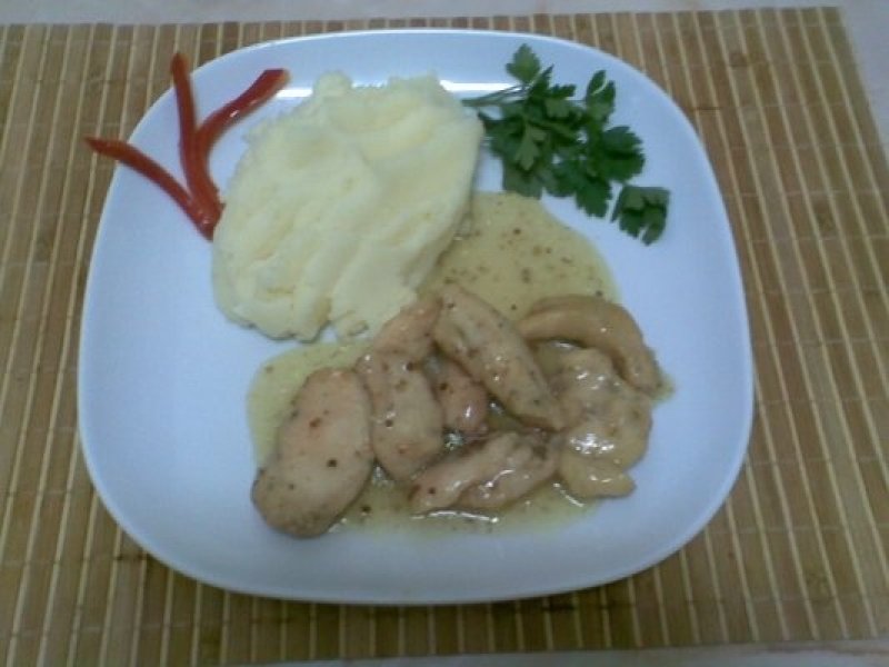 Pieptul de pui se taie feliute subtiri, se condimenteaza cu sare si piper se dau prin faina si se prajesc in ulei pana capata o culoare aramie, se scot pe un servet absorvant, apoi se adauga in sos si se mai lasa sa fiarba cateva minute. Pentru ingrosarea sosului eu folosesc o lingura de amidon dizolvat in putina apa.