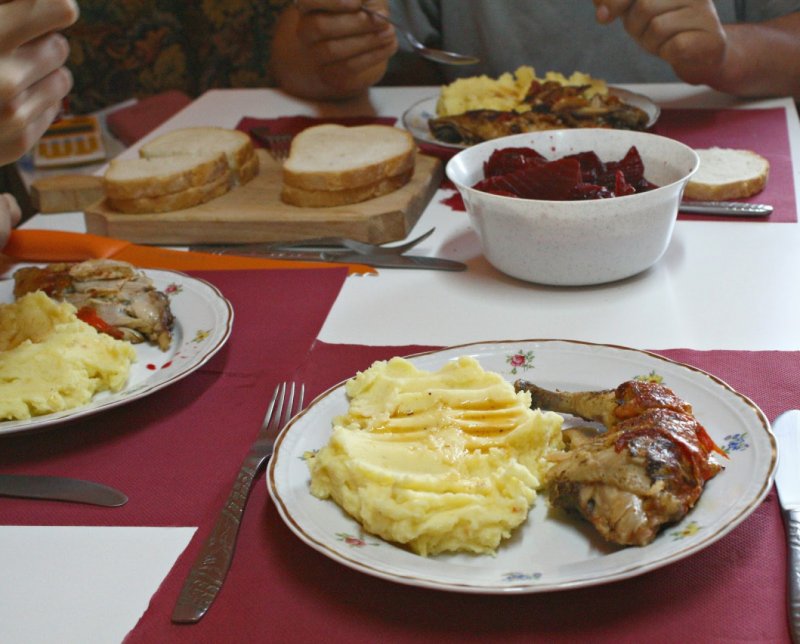 Cu siguranta deja bucataresele se gandesc la "meniul" pentru urmatoarea zi iar eu am pregatit aceasta reteta pentru duminica dupamasa (poza este facuta duminica trecuta insa nu am apucat sa o postez pana acuma).Deja este ca o "traditie" piureul de cartofi si carnea pentru duminica dupamasa si de altfel nu se cade bine sa iei masa in familie si sa nu pregatesti ceva absolut delicios! Iar piureul de cartofi si cu pulpe de pui cu ardei satisface orice moft! Puteti de altfel sa inlocuiti pulpele cu orice carne va este pe plac :) . Dupa cum vedeti in poza, deja ai mei s-au apucat de mancat iar eu salivam simtind mirosul mancarii, dar m-am adunat si am facut si cateva poze ca sa nu mai postez nepregatita pe blog :)).